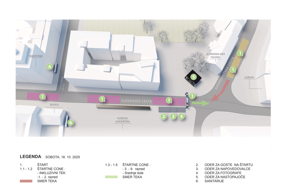 SLOVENSKA CESTA (start, pozor: prvih pet startov, do vključno deklice 2. razred, tečejo iz Gosposvetske ceste proti Kongresnem trgu, ostali v nasprotni smeri!)