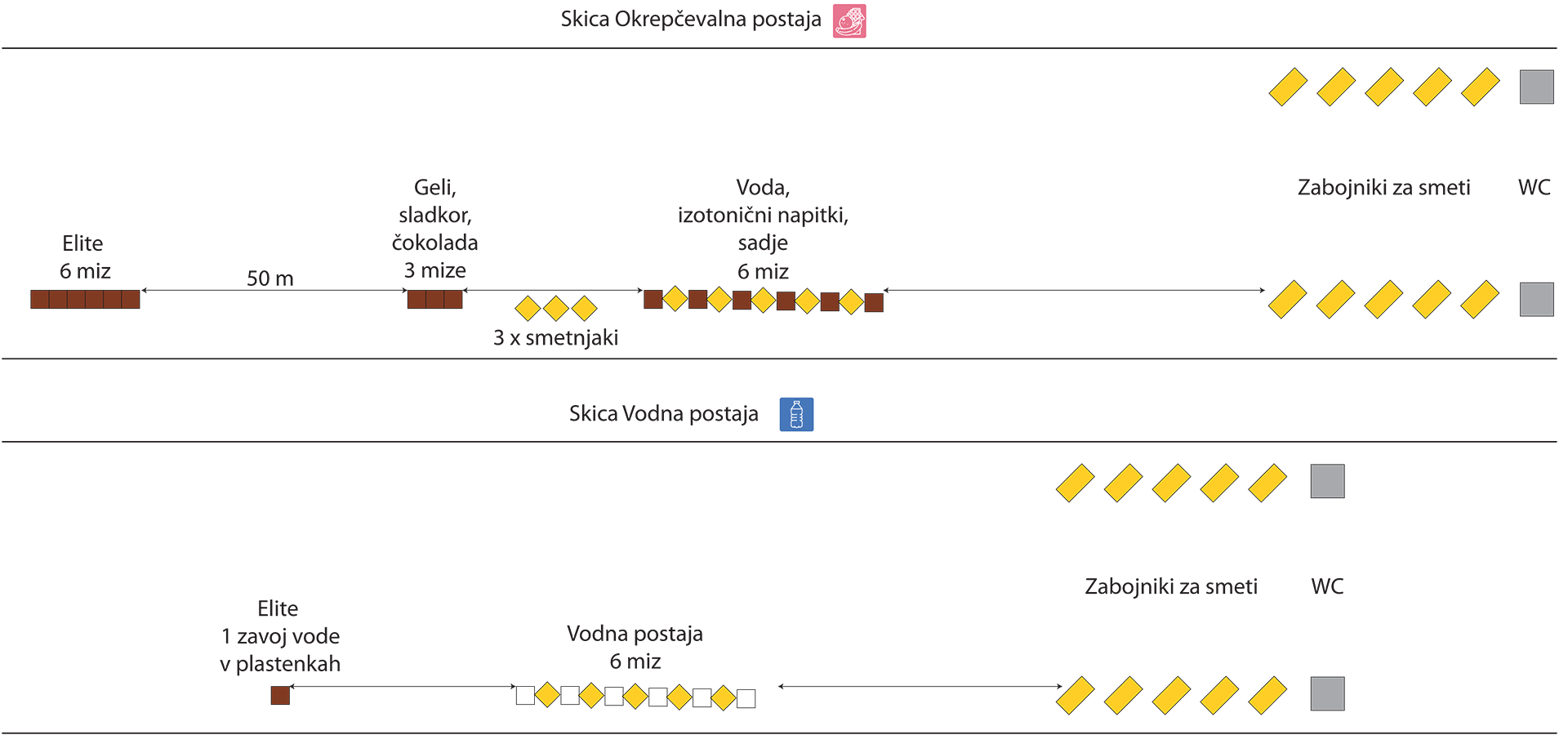 Na trasi maratona in polmaratona so okrepčevalnice postavljene na vsakih pet kilometrov; skupaj je osem okrepčevalnic. Razpored bo na vseh okrepčevalnicah enak (glejte skico), zato se na vrstni red okrepčil lahko pripravite vnaprej.