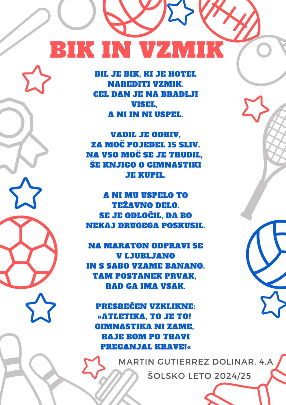 Za ustvarjalno idejo so učenci izhajali iz pesmi z naslovom Bik in vzmik, ki jo je napisal Martin Guttierez Dolinar (5. a). Skupaj s sošolcema Maksom Krnecem in Zarjo Hvalc je pesem prenesel v obliko izvirne table, ki je s svojo domiselnostjo in pozitivnim sporočilom navdušila tako obiskovalce kot žirijo. Oba dečka sta na maratonu tudi tekla, s čimer sta združila ustvarjalnost in športni duh – pravo srce Ljubljanskega maratona.