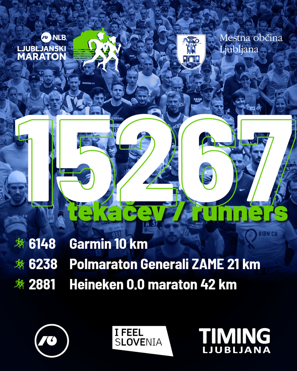 V nedeljo, 20. oktobra vas bo po ljubljanskih ulicah teklo 15.267 tekačev. Na Garmin 10 km vas je prijavljenih 6.148, na polmaraton Generali ZAME 6.238, na Heineken 0.0 maraton pa z velikim naskokom 2.881 tekač. Izjemno ponosni smo, da je Slovencev kar 10.175. Rekord vseh časov smo postavili s 5.092 tujimi tekači iz 86 držav. Veseli dejstvo, da smo prav na vseh razdaljah povečali število tekačev.