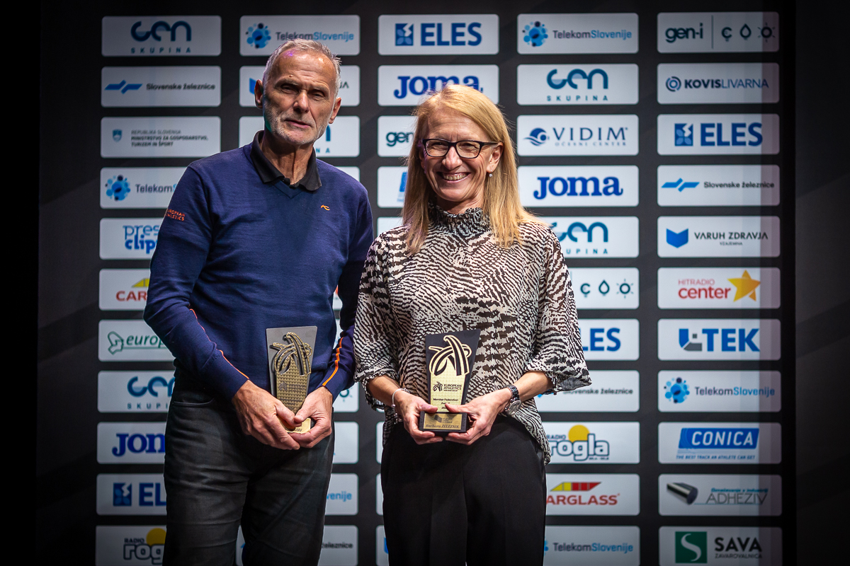 Na fotografiji je Barbara Železnik skupaj s Tomom Šarfom, ki je nagrado prejel za uspešno delo pri koordinaciji gorskih tekov na svetovni ravni, ob tem pa je tudi uradni traser prog na NLB Ljubljanskem maratonu.