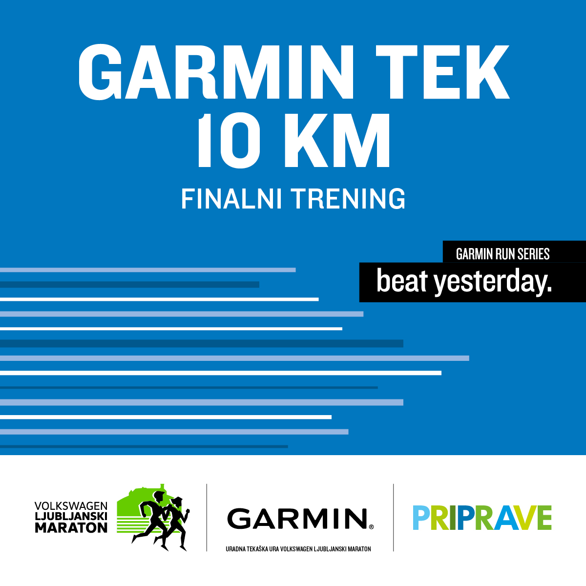 V nedeljo, 9. oktobra, vas vabimo na FINALNI TRENING za Garmin tek 10 km na Volkswagen 26. Ljubljanskem maratonu. To je zadnji skupinski trening. Skupaj z našimi trenerji s projekta Priprave bomo izvedli tekaški del treninga, kot tudi vaje za pravilno raztezanje in krepitev pomembnih mišic za lažji in udobnejši tek.