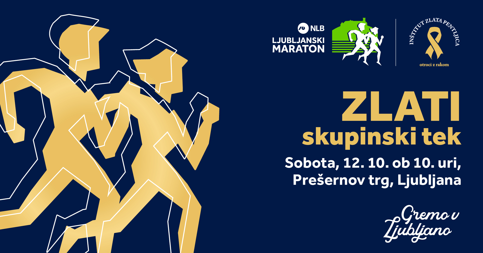 V soboto, 12. oktobra vabimo na brezplačen ZLATI TEK pod okriljem NLB Ljubljanskega maratona. Z dogodkom povezujemo tekače v zgodbo »Gremo v Ljubljano«, tokrat s tekom podpiramo deklico Tinko in sodelujemo z Inštitutom Zlata pentljica (Vsa zbrana sredstva na NLB Ljubljanskem maratonu bodo šla za nakup slušnega aparata, saj ima Tinka za seboj zelo težko zgodbo boja z rakom).