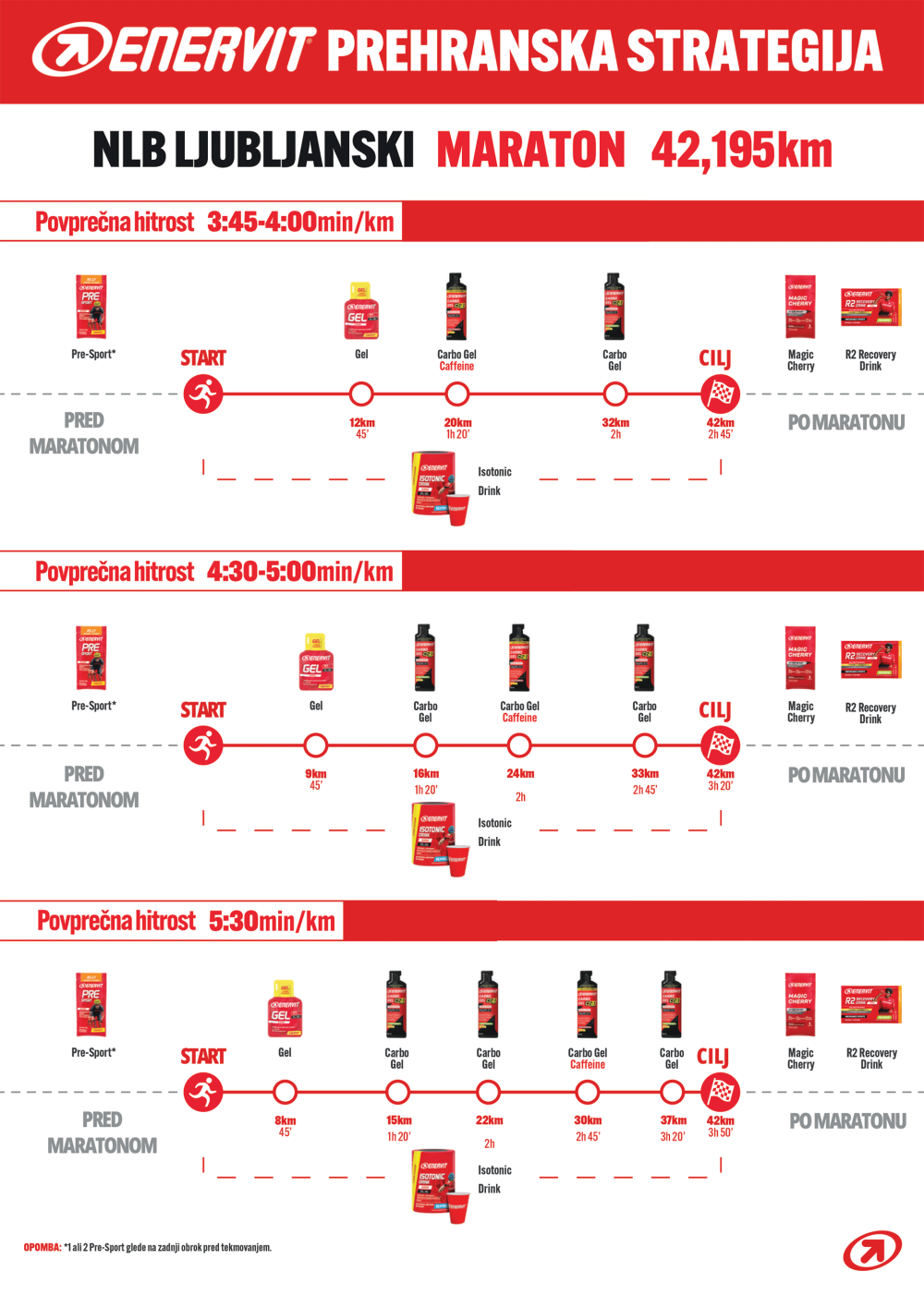Nujno je tudi narediti plan, kdaj oz. na katerem kilometru bomo zaužili Enervit Isotonic gel ali Enervit gel. Enervit Gel (limona in pomaranča) bo na voljo na 17km, kjer bo tako kot vsako leto ENERVIT cona.