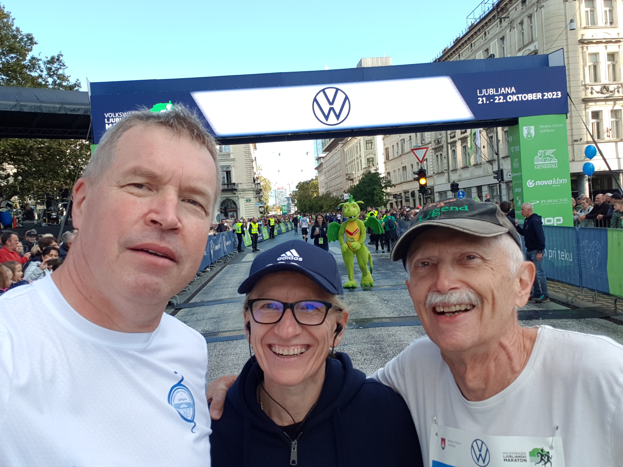 Že po štartu, ki pa se naju ni tikal, saj se vsakomur začne meriti čas šele po tistem, ko prestopi štartno črto, me je nagovoril neki Marjan ali Marijan Zore, s katerim sva se že tudi lani srečala prav na repu tekaške množice in se lepo pomenkovala. Zelo sem se ga razveselil, bil mi je kot ugodno znamenje, podobno kot vreme, a tekla sva vsak zase. Po teku pa mi je poslal najine fotke, ki jih je mimogrede posnel. Pa še eno, na kateri sva skupaj z neutrudno direktorico Timinga Barbaro Železnik, ki se nama je pridružila. Brez nje bi prireditev velikokrat zašepala – podobno kot jaz.